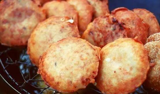 5.仔细观察,刚放进去的时候由于萝卜中含有水分,油锅会稍稍沸腾。等海蛎包浮上来时,就已经成型阶段 ,这时白色的海蛎包边沿有点呈现黄色。就用筷子反转海蛎包,继续炸。两边都呈现金黄时候就可以出锅了。