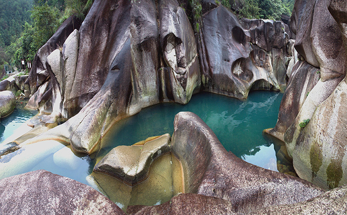 龙亭溪峡谷是十分罕见的发育在花岗岩中的峡谷深切曲流。沿途河曲、跌水、瀑布、浅滩、深潭频现,壶穴形态各异,形成动静结合壮丽优美的深切曲流水景大观。