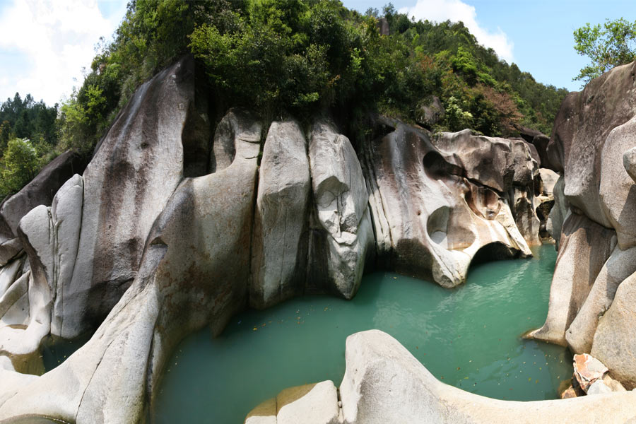 白云山之美在于石奇。顺着两面悬空的小路,几乎直上而下,低头向下望去,不禁叫人胆战心惊,可见到这样陡峭的峰峦,白云山真髙啊,一个个山峰直插云端,不见绝顶,回头一望,都会发出惊呼:“好险啊".顺溪而下满溪皆臼,哪石臼形态万千,肖形状物,有心状的、有眼状的、有蝌蚪状的、有葫芦状的……更多的是形容不上的形状。这样自然构成的造化,都是物质起灭的缘分。很多的石臼都得裸露在大青天之下,如一双双睁大的眼睛,遥望着太空,那各种各样的壶穴、槽、洞、潭等一窝一窝一泓一泓,让人目不暇接,有落差的石臼就是大盆大家闺秀,有如“瑶池”、有如葫芦潭、有如岩槛与深潭,这错宗复杂,朴朔迷离,且无法诠释的石臼,你不得不叹服自然的鬼斧神工和时空的深不可测。当我继续往下走去,走进“三叠石”处时,见到了那里水声潺潺,花气袭人,景致优美,造型奇特,三块风化的大石头,临溪而叠,挺拔陡峭。
