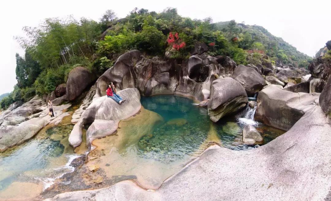 白云山之美还在于洞幽。九龙洞是一处壮观的冰臼,飞流直下的瀑布让我感到了庐山瀑布的雄伟;陡峭的山壁让我感觉到一种奇特的自然美……九龙洞几乎在峡谷的最末端,也是最最精彩的一笔,潭深、瀑急、石怪、境幽。钻进“九龙洞”那溪流两侧削壁因重力崩塌而滚落至河床的巨大砾石堆积成的迷宫状“巨砾堆积洞”,令人在惊叹大自然的鬼斧神工之余。到了“通心穴”有三个穴是壶穴相互联通形成,看到“瑶池”,似如瓮状壶穴,光线伸手不见五指,然后登铁梯来到了“飞天井”水珠飞溅,像一条银色绸带,从云天里抖落而下,缝隙间哗哗的水声,飞势雄伟,真的“飞流直下三千尺,疑似银河落云天”。继续往下走,从高处俯瞰蟾溪,有一种从历史走来的感觉。