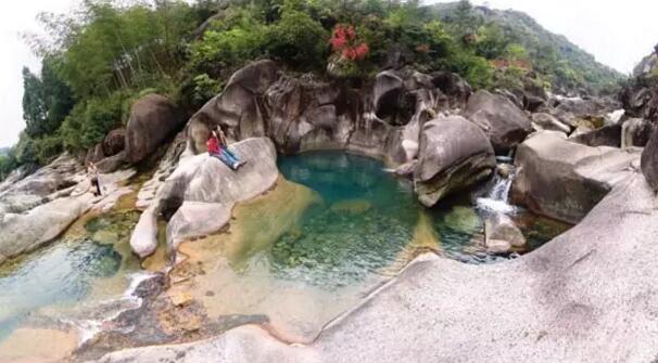 雨越来越大,整个山涧整个石臼白蒙蒙一片。与同游者一起,索性脱去上衣。雨声中隐约交杂着笑声。我们丝毫没有注意到,身后那位年轻的女导游。她带领我们一起往下走,第一站时,就是她让我们猜一猜,那块平如镜子的岩石的神奇。